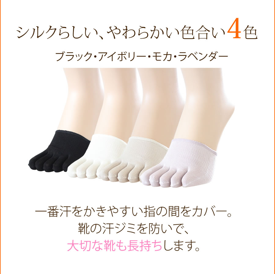 商品名 高級 シルク 5本指 ハーフ ソックス サイズ 22cm〜24cm カラー ブラック/アイボリー/モカ/ラベンダー 着丈 素材 シルク90% (高級絹・絹紡糸) ナイロン7%/ポリウレタン3% (補強糸) ご注意 シルクの性質上、洗濯すると繊維が収縮して、履きにくくなります。